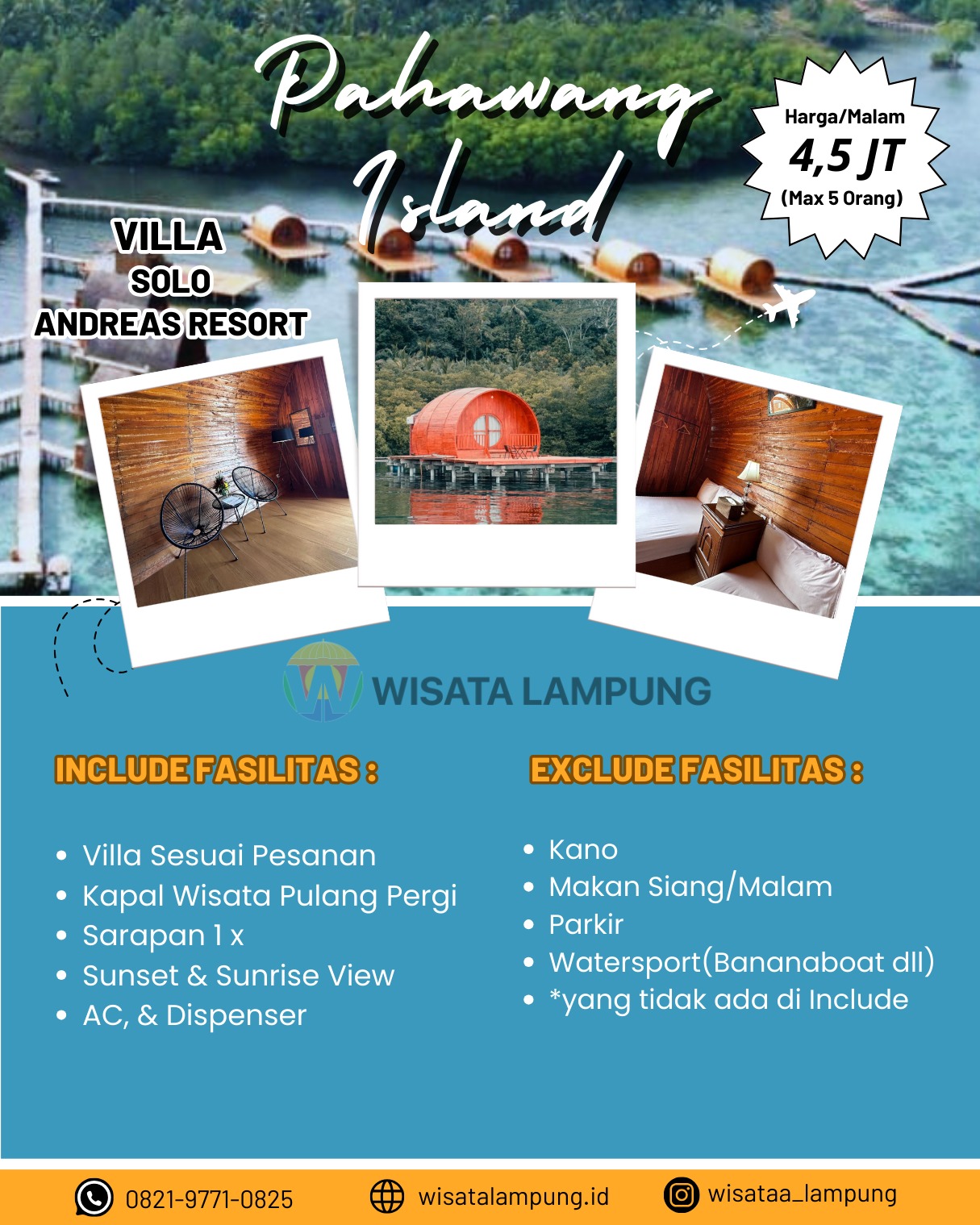 Selamat datang di Villa Andreas Resort Pahawang - tempat di mana kemewahan bertemu dengan keindahan alam yang menakjubkan! Dalam tipe Villa Solo kami, Anda akan merasakan pengalaman menginap yang istimewa dan penuh kenyamanan. Dirancang dengan sentuhan elegan, villa ini menawarkan ruang pribadi yang luas dengan fasilitas lengkap seperti kamar tidur yang nyaman, area lounge yang menyenangkan, serta balkon pribadi untuk menikmati pemandangan spektakuler sekitar. Nikmati liburan Anda dengan privasi yang sempurna dan layanan berkualitas tinggi di Villa Andreas Resort Pahawang. Pesan sekarang untuk pengalaman tak terlupakan!